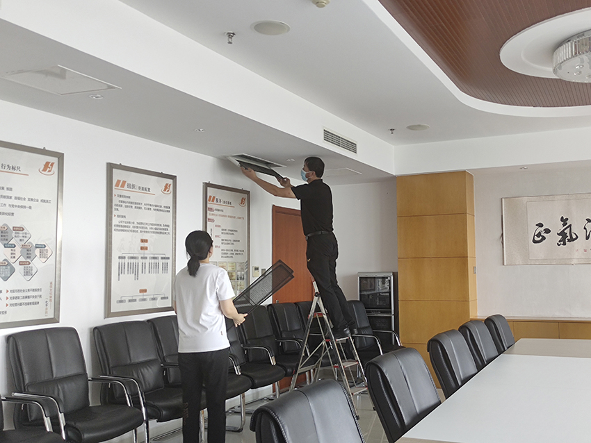 盛夏來臨之際,泰和大廈用電管理小組踐行公司“勤儉持家”經營理念,主動對區域內空調風口全部進行清洗,以提高空調效能、降低能耗、節省用電。