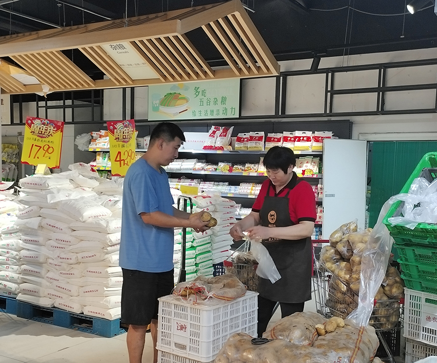 店慶期間,高新店同事們?yōu)榉奖泐櫩桶葱栀?gòu)買(mǎi)、減少排隊(duì)時(shí)間,利用中午休息時(shí)間提前將土豆分級(jí)裝袋。
